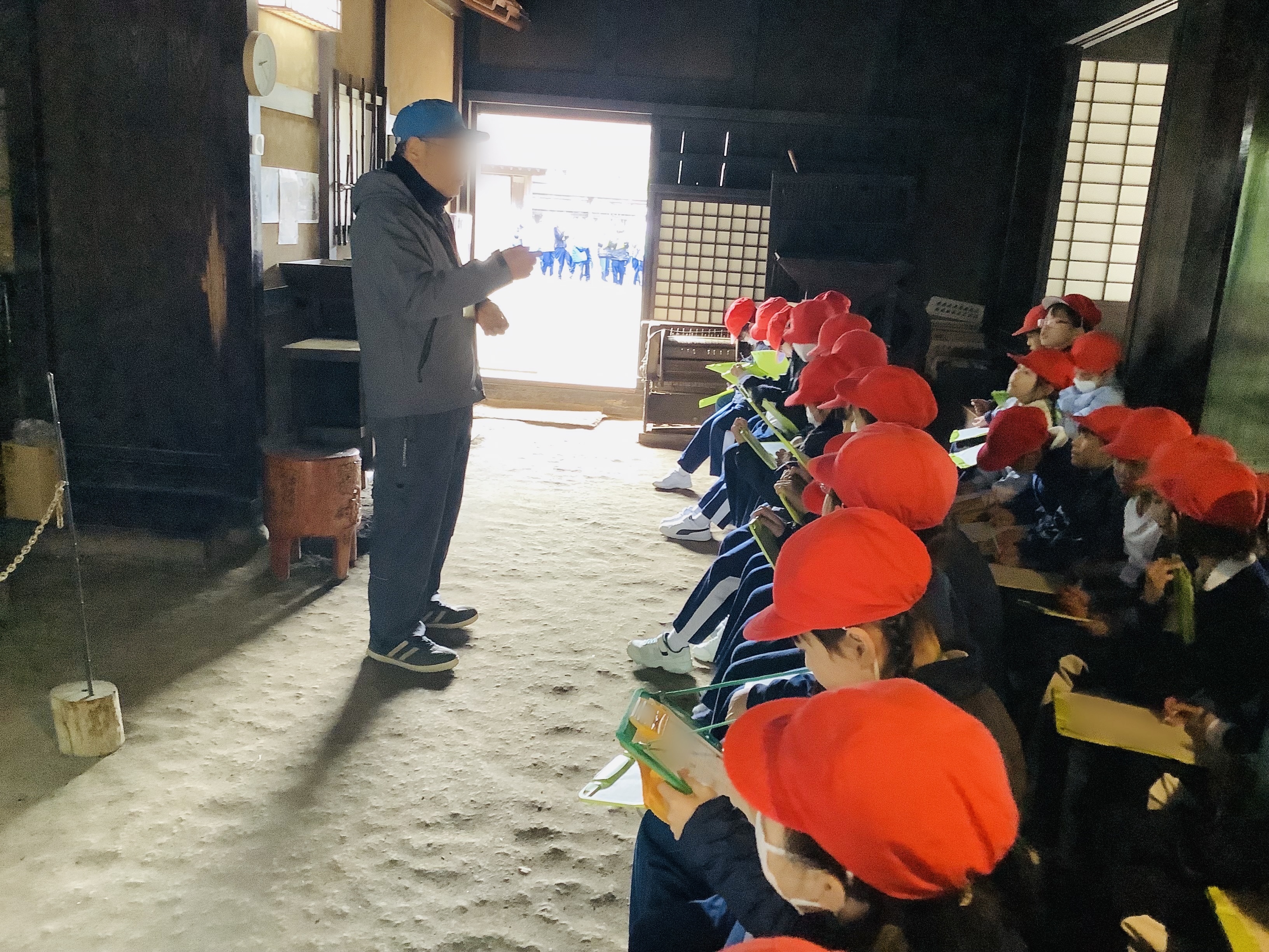 係の方から、古民家の外観や、内部の様子について説明をうかがい、子ども達は熱心にメモを取り、質問をしていました。