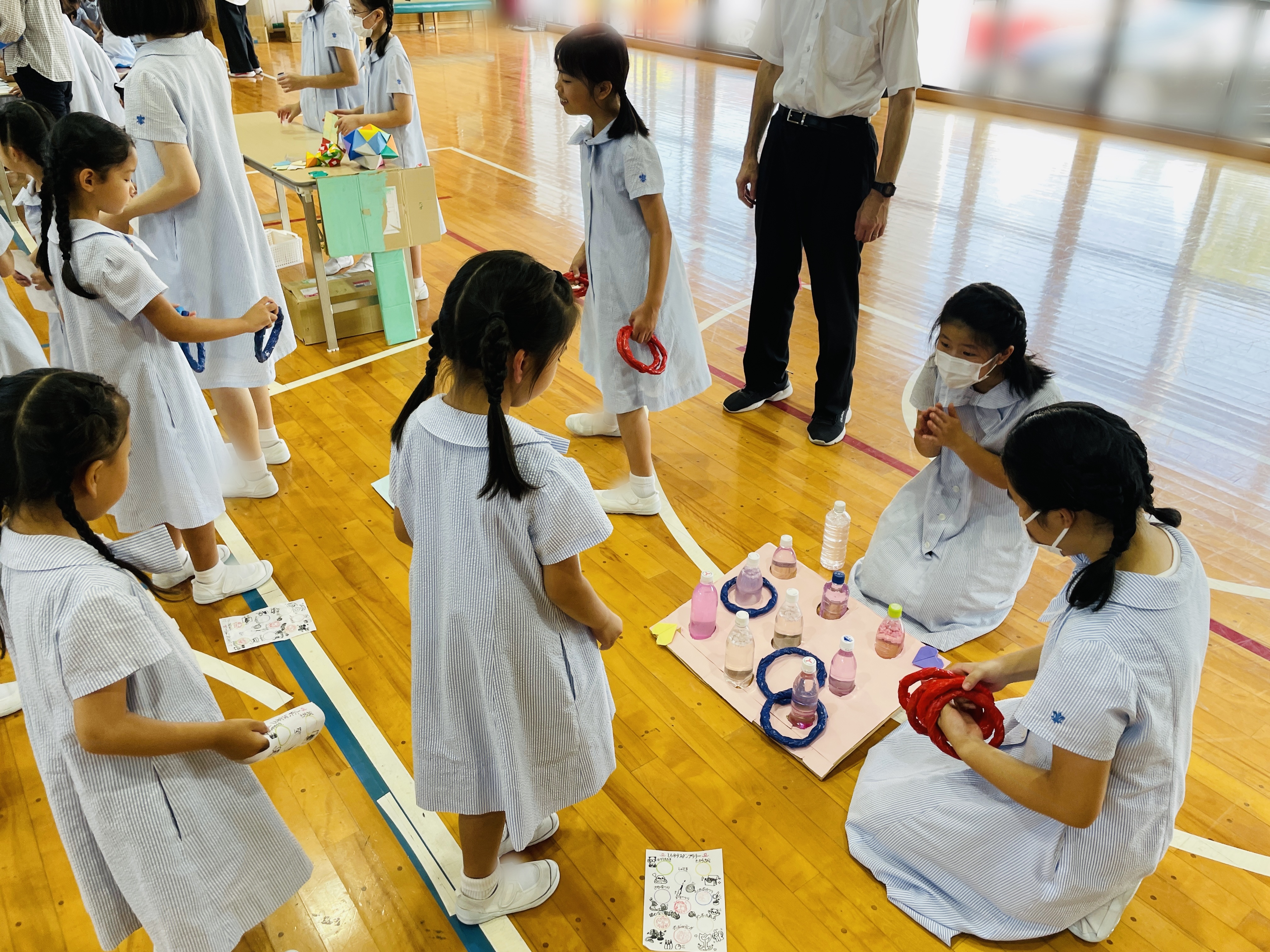6年生は、ヨーヨーつりやスーパーボールすくい、輪投げ、段ボール迷路など、自分たちで企画し準備したブースに1年生を招き、楽しいひとときを過ごしました。
