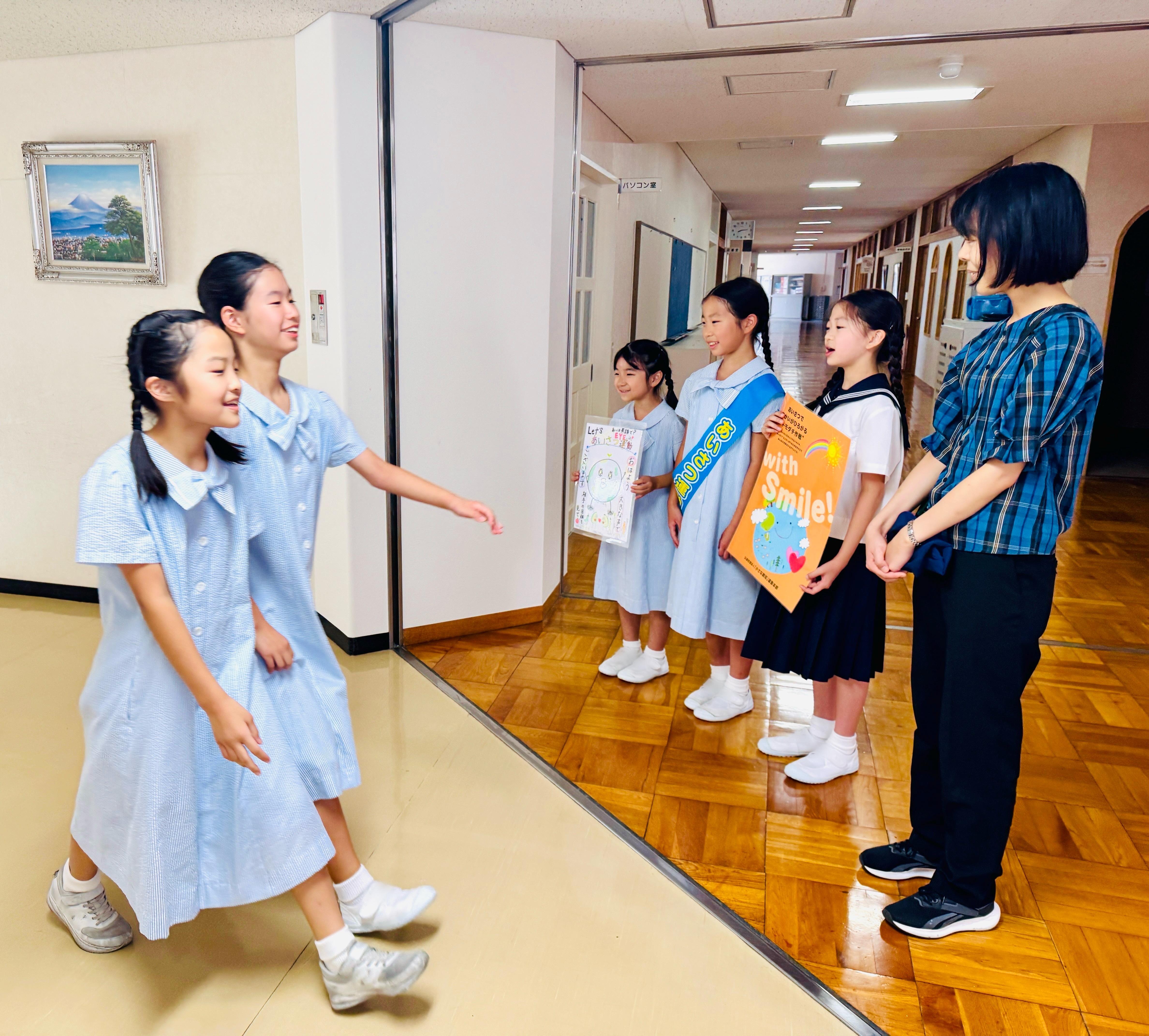 学校生活 2025.09.26 あいさつ運動 児童会による「あいさつ運動」が行われました。 「挨拶のアイは、英語でeye」。 “eye”=「目」、ということで、「目と目を合わせて挨拶をしよう」と呼びかけました。 子どもたちは普段のあいさつに加えて、相手の目をしっかり見て伝えることを意識し、いつも以上に気持ちの良いあいさつが校内に響きました。