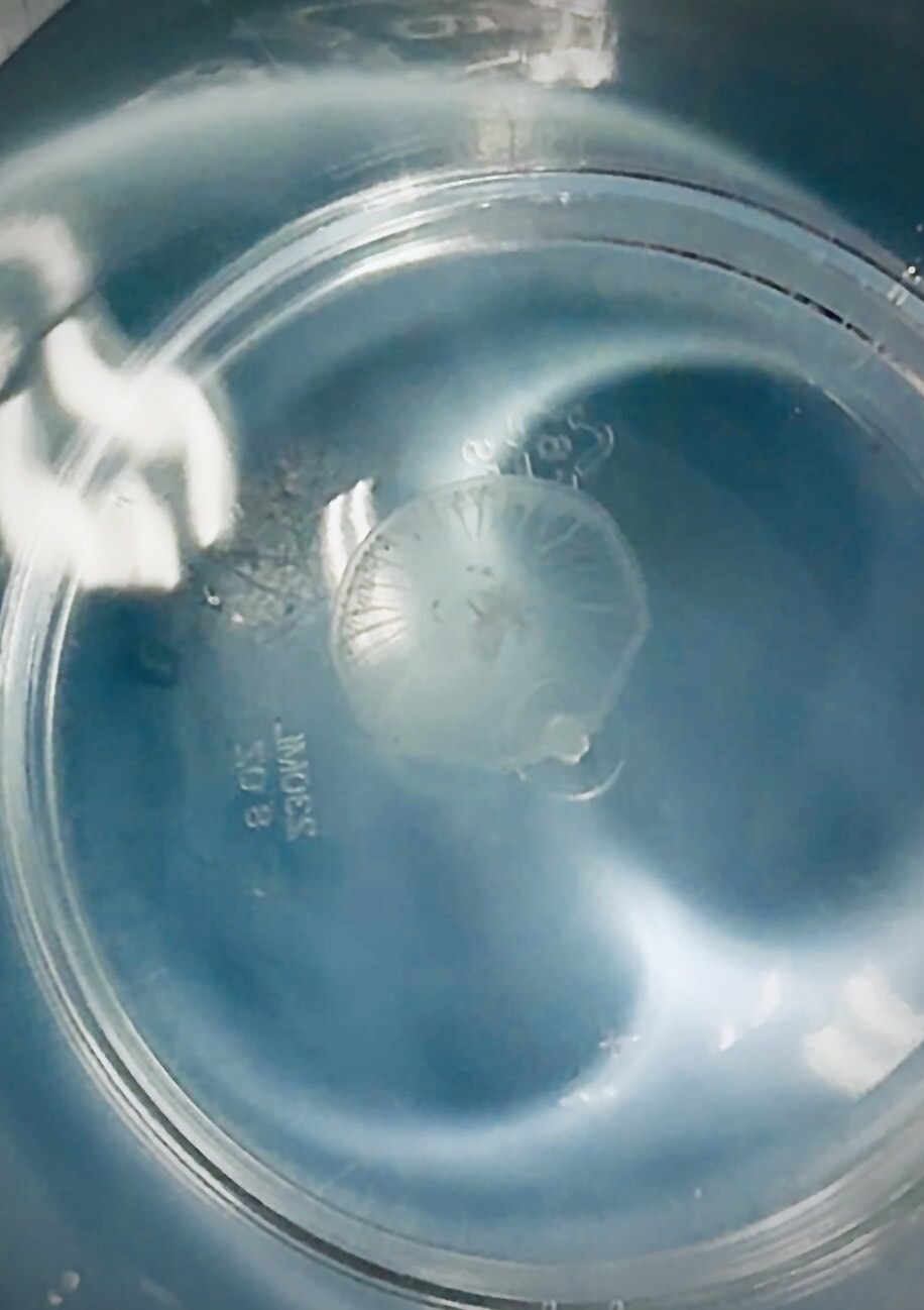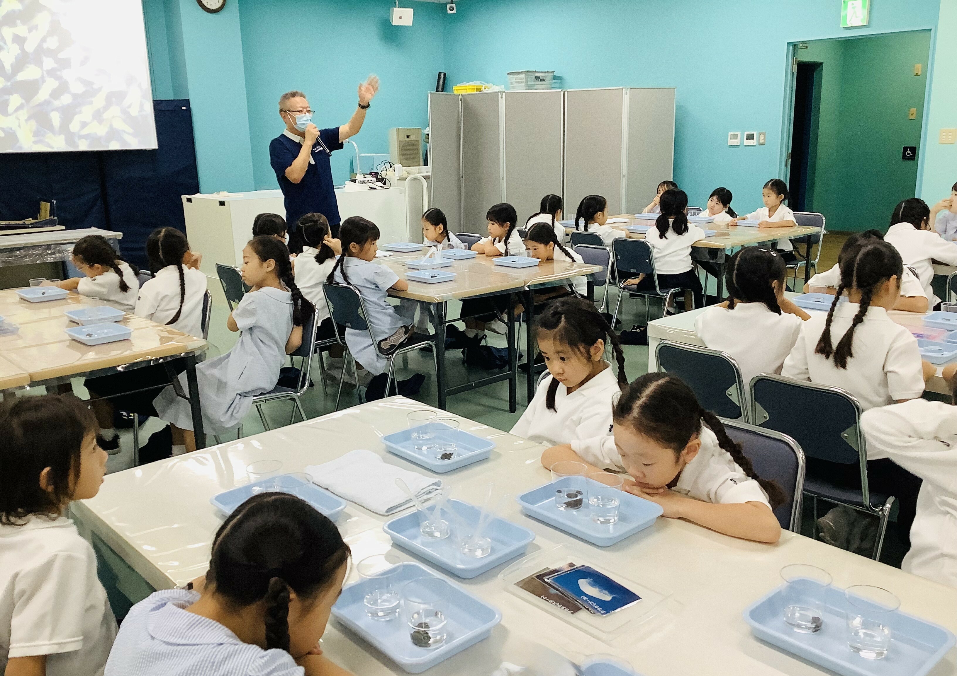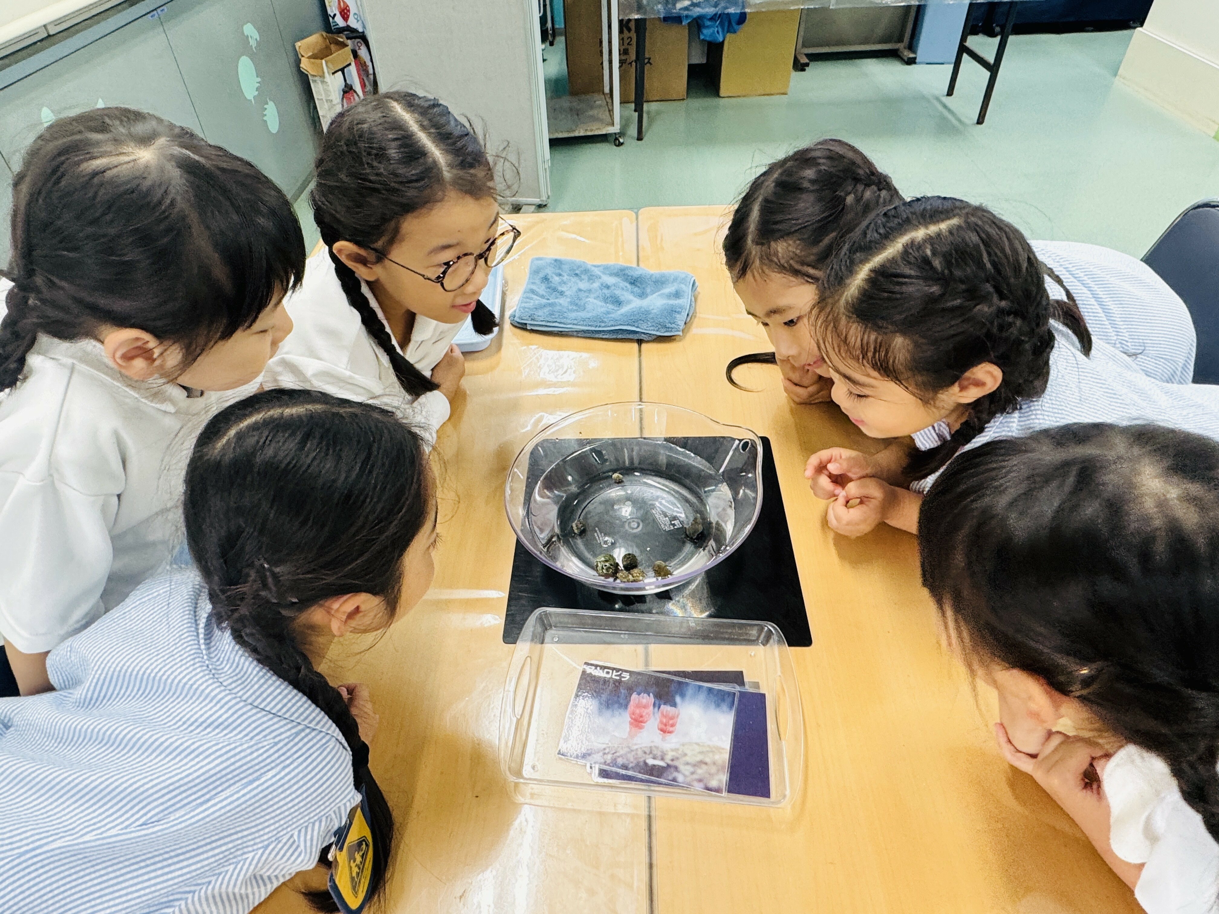 最後に、1センチほどの小さなミズクラゲの観察をしました。ブラインシュリンプという動物プランクトンの餌をあげました。四つ葉のクローバーのような模様は胃で、餌が体の中に取り込まれると、クローバーの模様が餌のオレンジ色へと変わっていきました。クラゲも動物プランクトンという生き物を食べて生きていることを知り、私たちと同じように「命が他の命によってつながっている」という大切なことを教えていただきました。