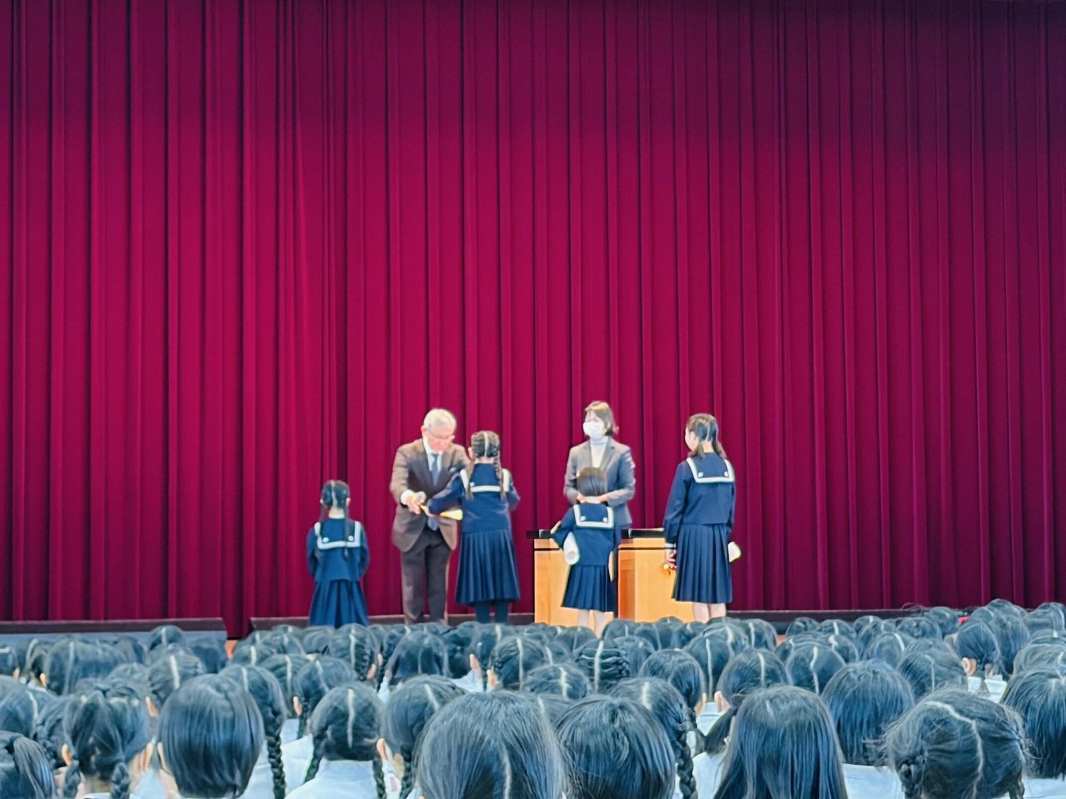 表彰式では、全校児童が大きな拍手でお祝いしました。