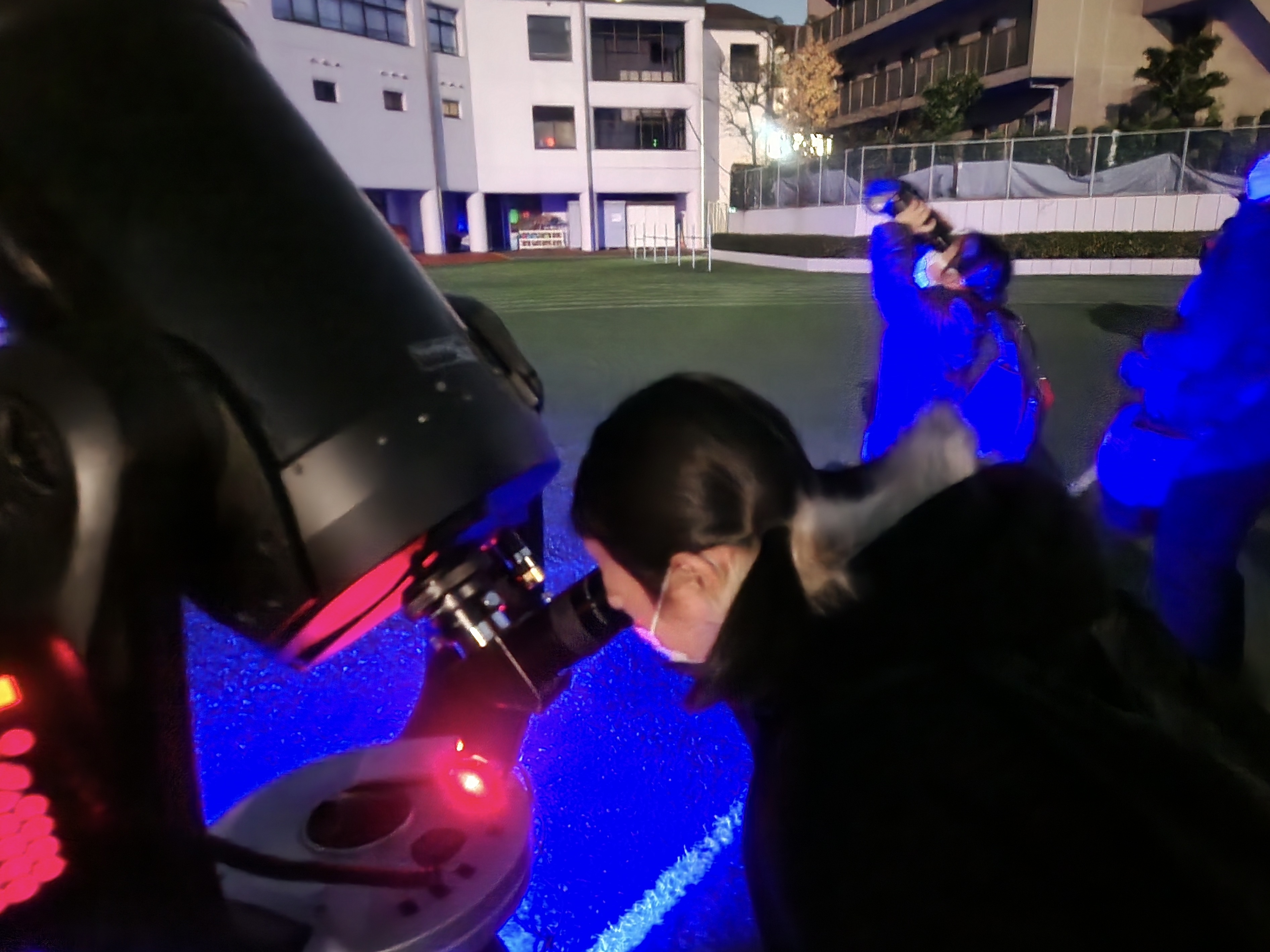 天体観測の専門家であるスターゲイズさんにご協力いただき、校庭に設置された6台の天体望遠鏡にそれぞれ満月・土星・アルビレオといった星々を写して観測を行いました。 写真の満月は、望遠鏡を覗いて撮影したものです。