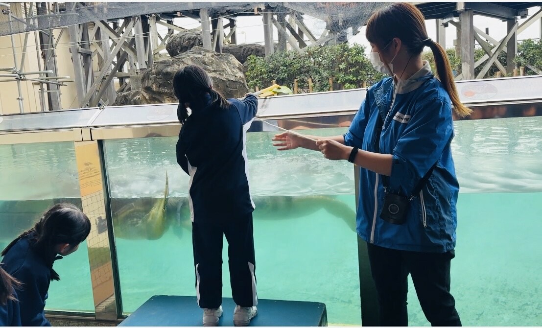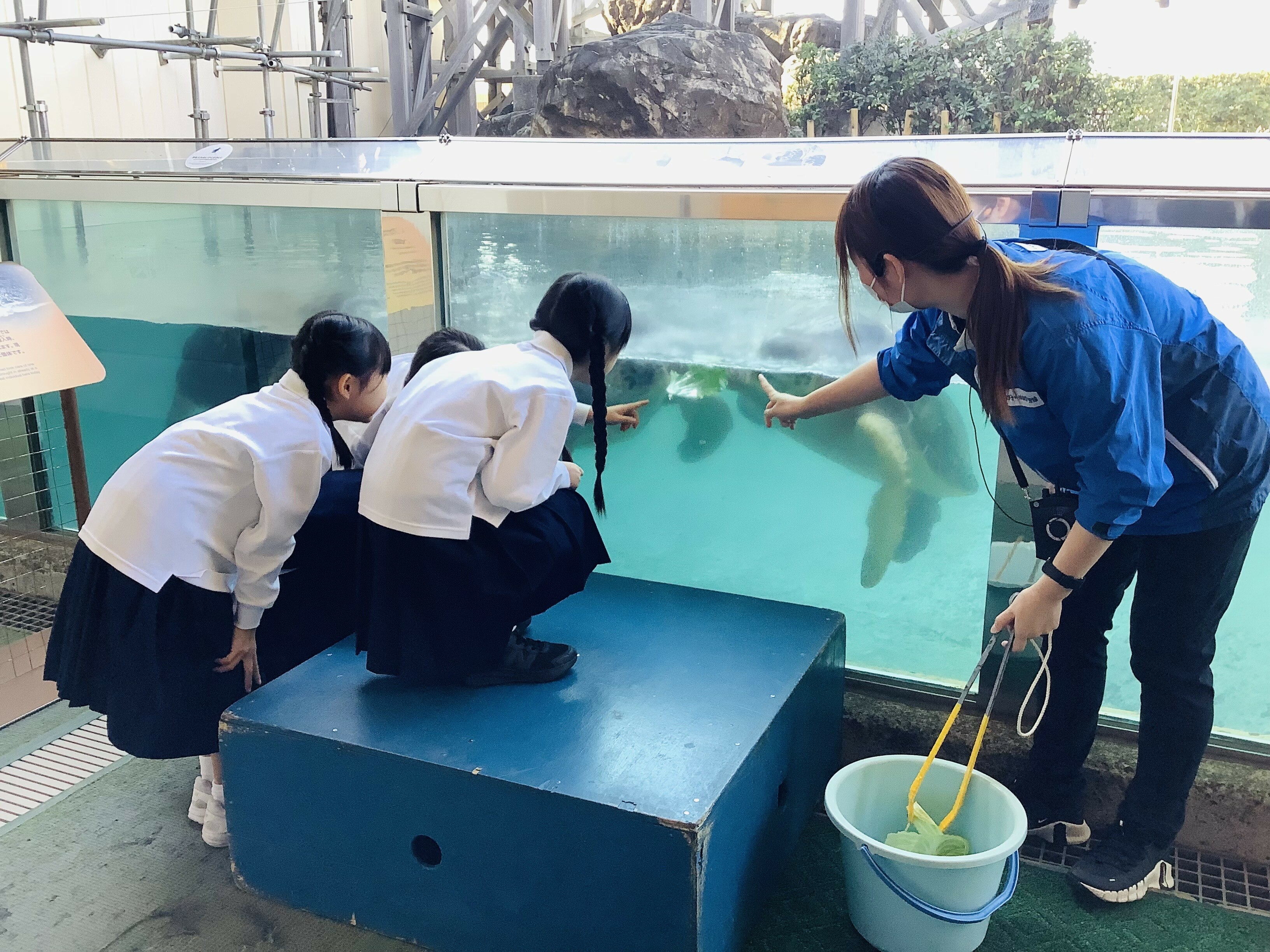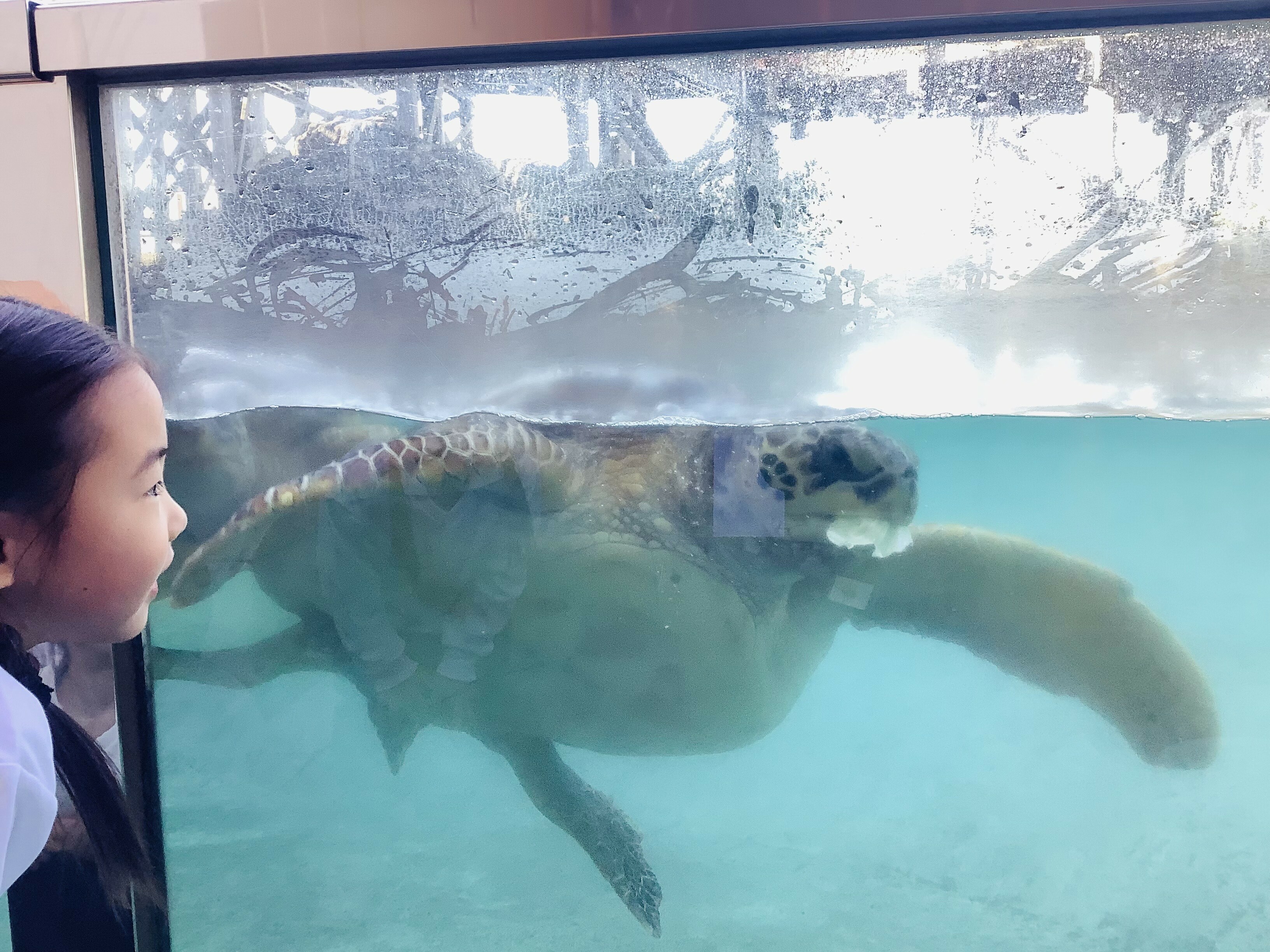 ウミガメの種類や、ウミガメとリクガメのちがいについて学び、ウミガメにキャベツをあげる体験もしました。