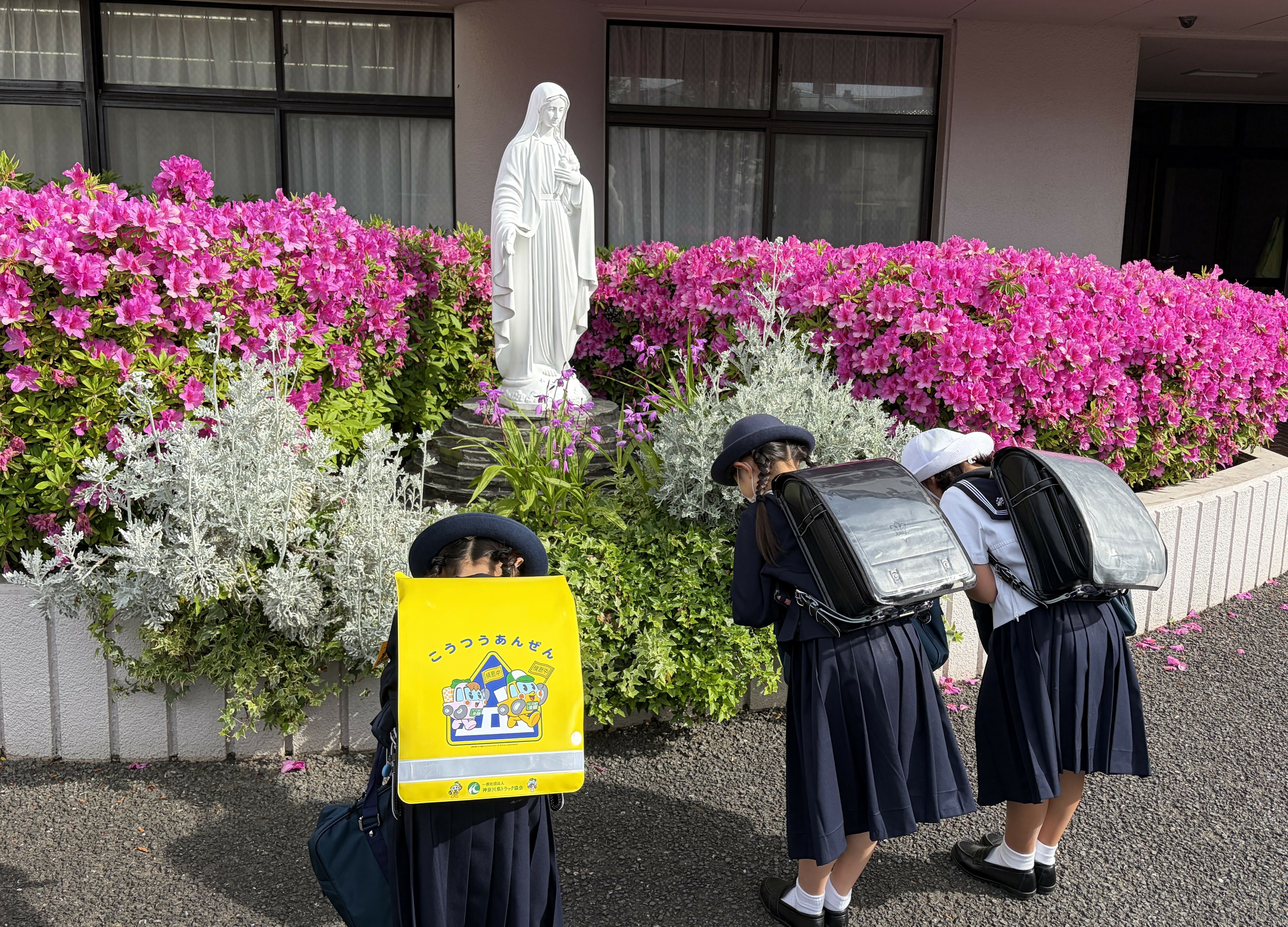 毎年この時期になると、学校のツツジが咲き誇り、正門のマリア様も、色鮮やかなお花に囲まれています。